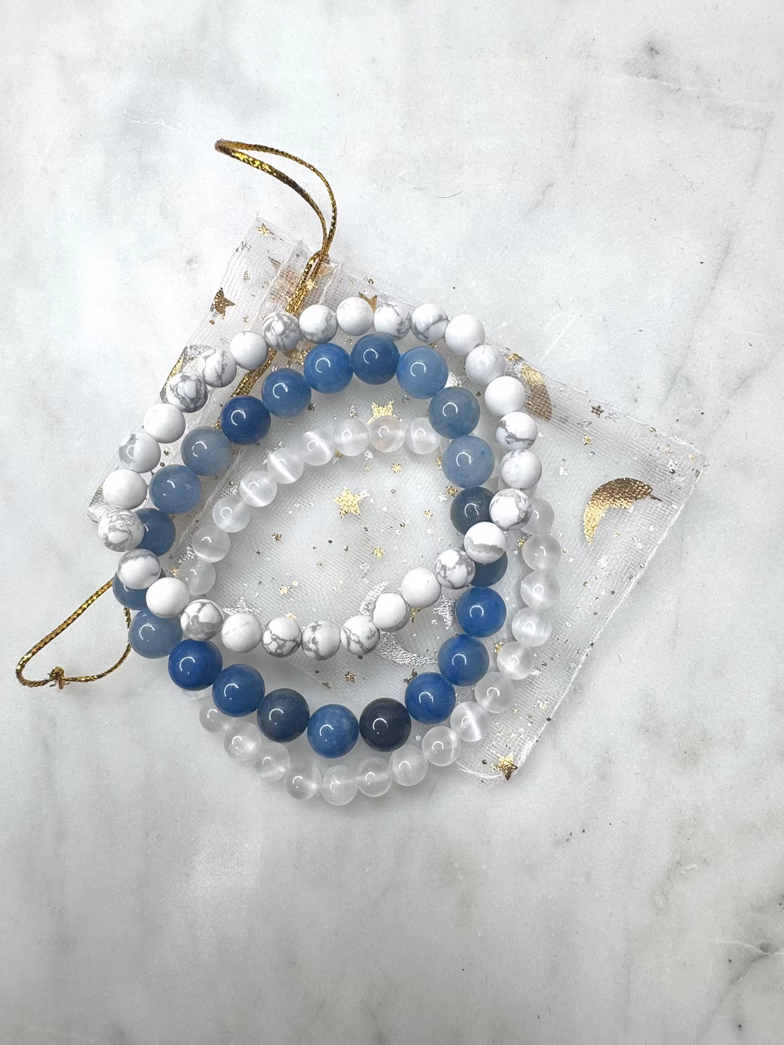 innehållaer 1st blå aventurin 8 mm, 1st satin spar 6 mm, 1st howlit 6 mm