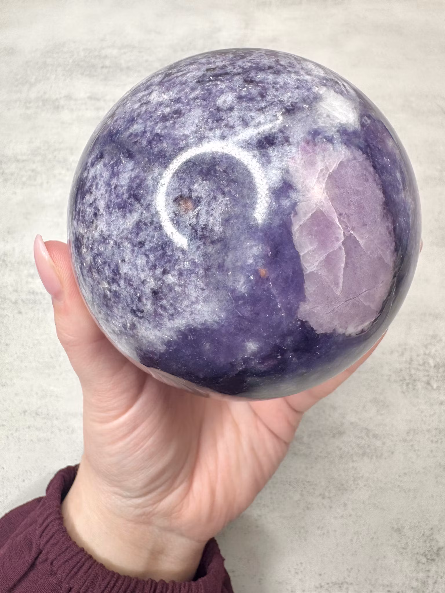 Detta unika lepidolitklot är ett one of a kind! Klotet har färgskiftningar i djupt mörklila till mjuka lavendeltoner.